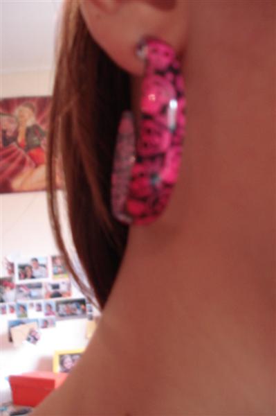 Plus nog zwarte oorbellen met allemaal roze figuurtjes erop,